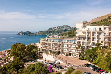 Отель расположен на утесе под Таорминой у моря. Из отеля открывается потрясающий вид на фантастический залив Джардини-Наксос и остров Изола-Белла. Здание отеля расположено на фоне горы Этна со снежными вершинами. В каждом номере есть балкон. Из окон классических номеров открывается вид на сад, а из улучшенных номеров - полный вид на море